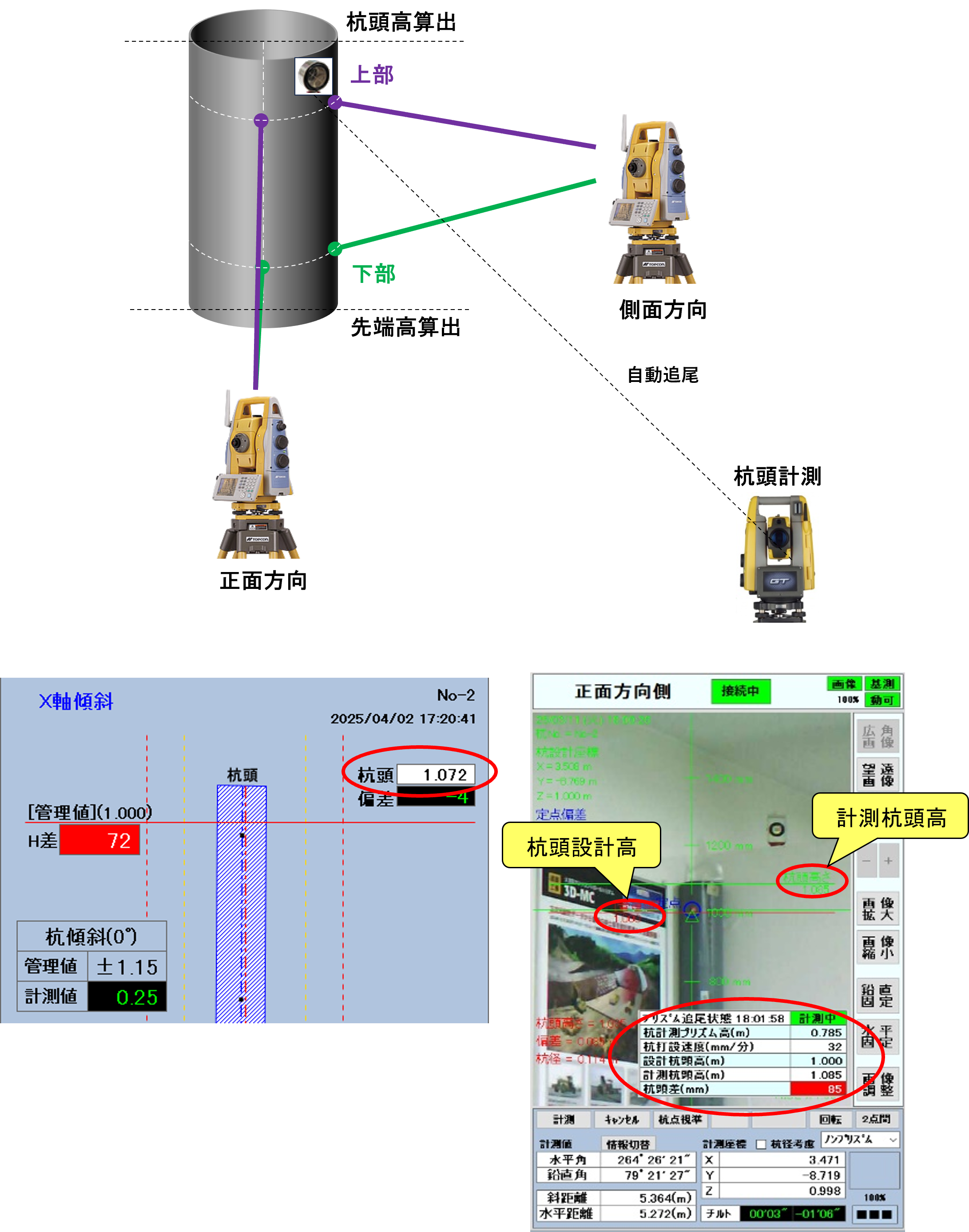 リーダー等にプリズムを固定し、別のトータルステーションで自動追尾し、リアルタイムに杭頭高を計測します。また設計杭頭高と比較した差も表示します。
