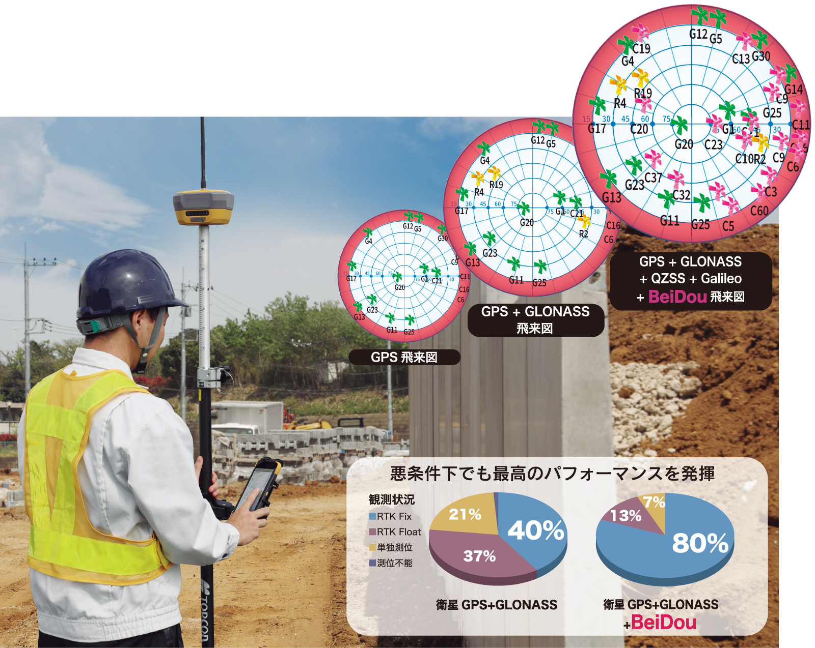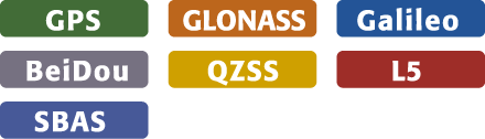 GPS はL1、L2 に加えL5※¹ を受信でき、GLONASS、QZSS、BeiDou※²、 Galileo※³ そしてSBASも利用可能です。また、448 のチャンネル数に対応することで、今後増加傾向にある衛星数にも余裕を持って対応することができます。