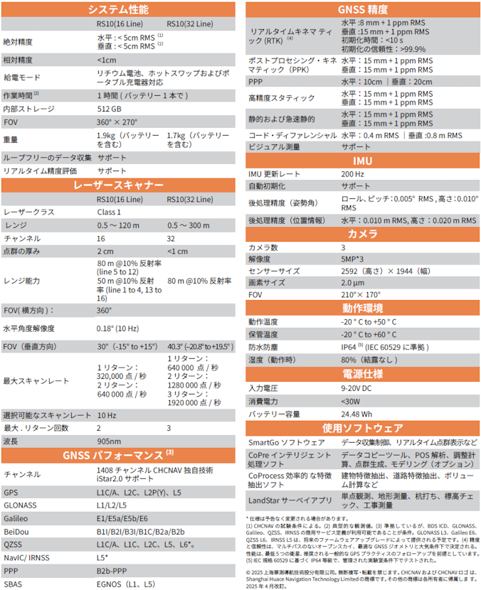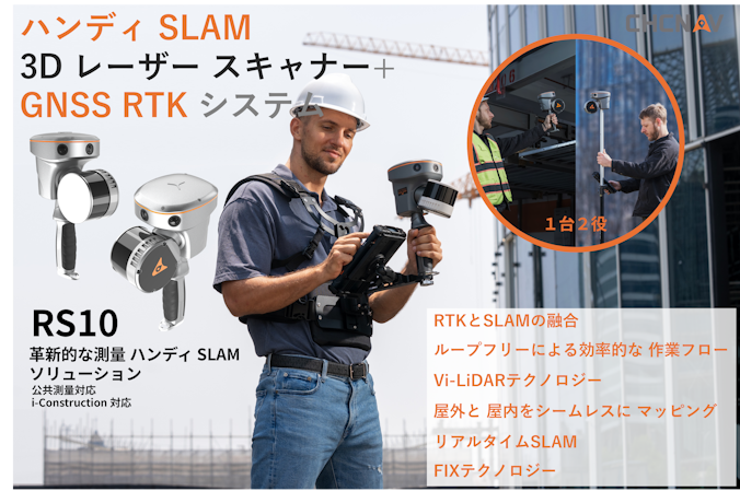 | RS10 は GNSS 技術開発における CHCNAV 独自技術の結晶です。第 4 世代の電波式 GNSS アンテナを搭載し、様々な劣悪環境下で 3 ㎝以内の RTK測位精度を提供します。高精度 LiDAR と3 台のHD カメラを組み合わせることで、RTK、レーザ、ビジュアル SLAMを統合し5 ㎝の絶対精度を実現します。高精細な建築調査から複雑なインフラプロジ ェクトまで、RS10 は専門性を高め、高精細なデータを効率的に収集するために必要なツールを提供します。 |