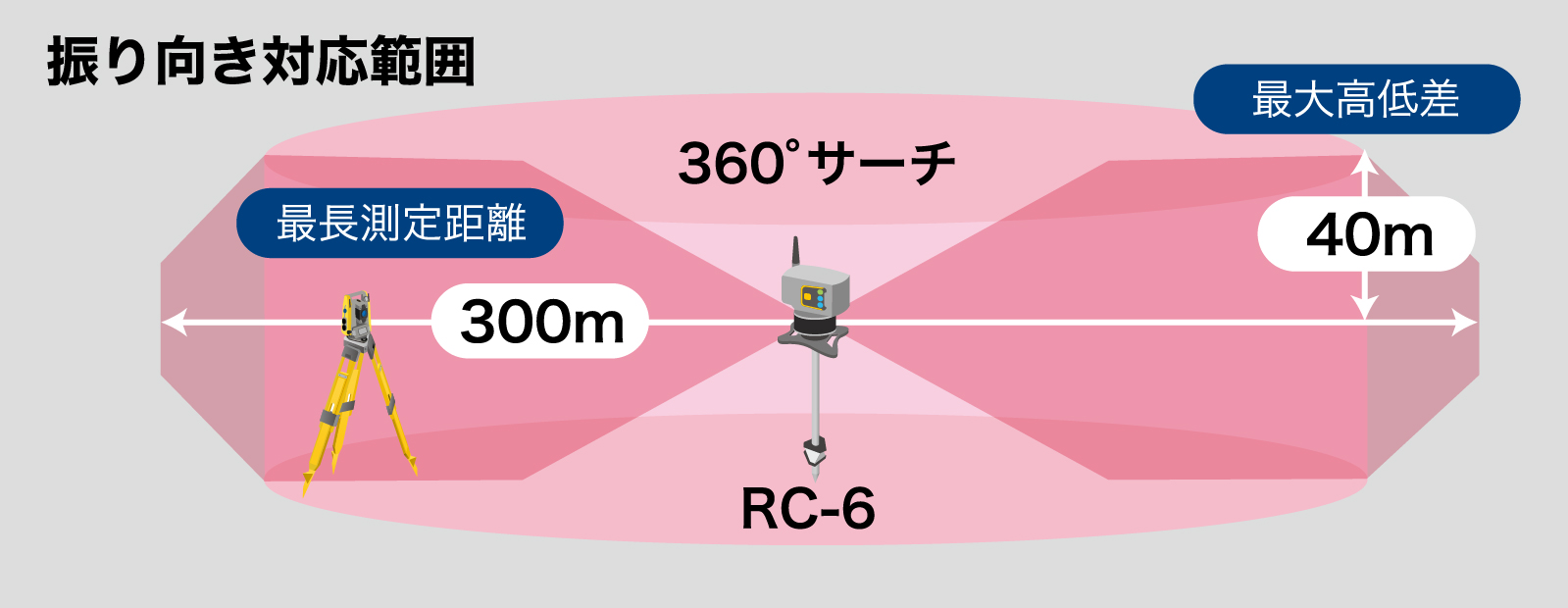 RC-6からサーチ光を射出。トータルステーションがプリズムを見失っても、RC-6を正対させることなく、素早く確実に再捕捉できます。![]() |
