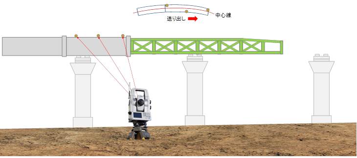 線形計算オプションとは、ソフト上で線形計算を行い、計画中心線から対象物の変位をモニタリングすることが可能です。橋梁の送り出し工法やその他線形管理が必要な施工フィールドで活用いただけるシステムです |