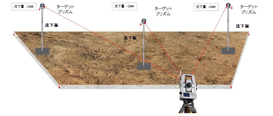 沈下板にプリズムを設置し、初期値の登録や計測サイクルを設定後、自動的に計測し、沈下量の管理が容易にできます。平面図取り込み機能より図面上のどのポイントがどのような形で数値が変わるか別画面で全体図から把握できる機能もついております。 |